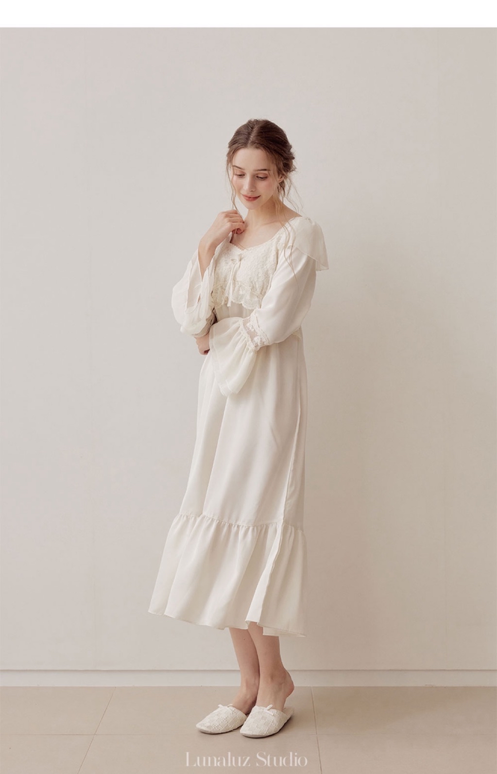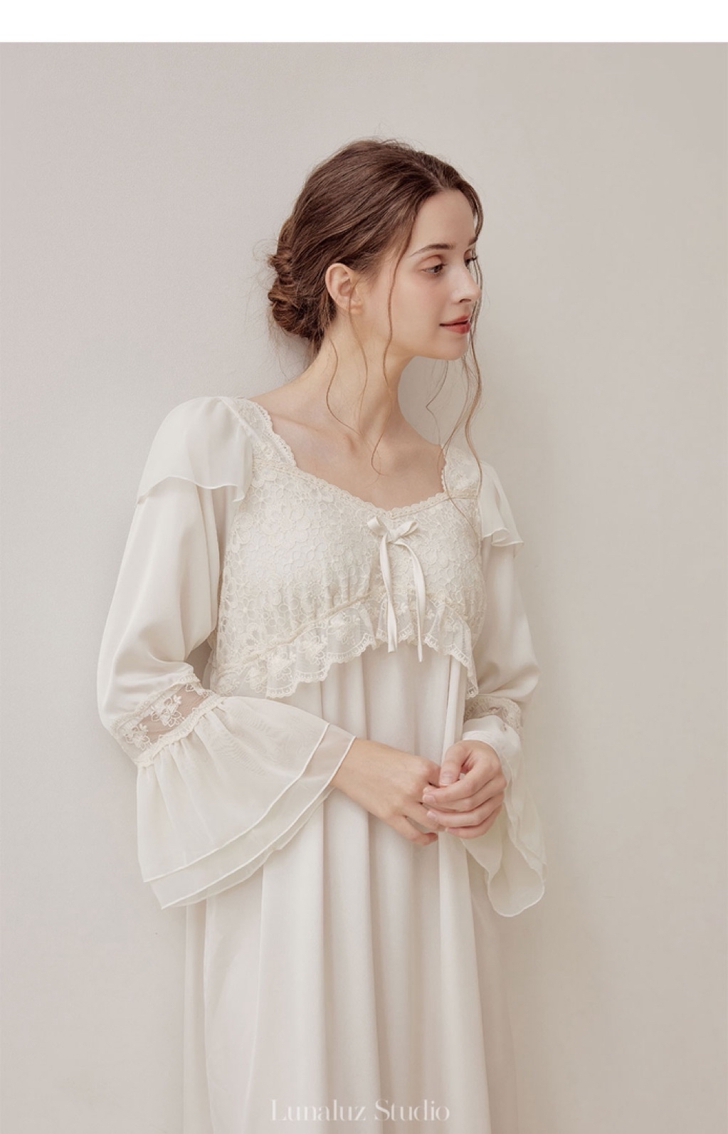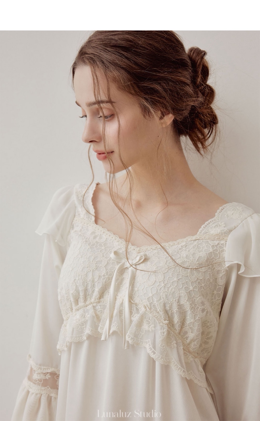 正韓☆LUNALUZ☆ 蕾絲拼接長袖睡裙|宮廷優雅風