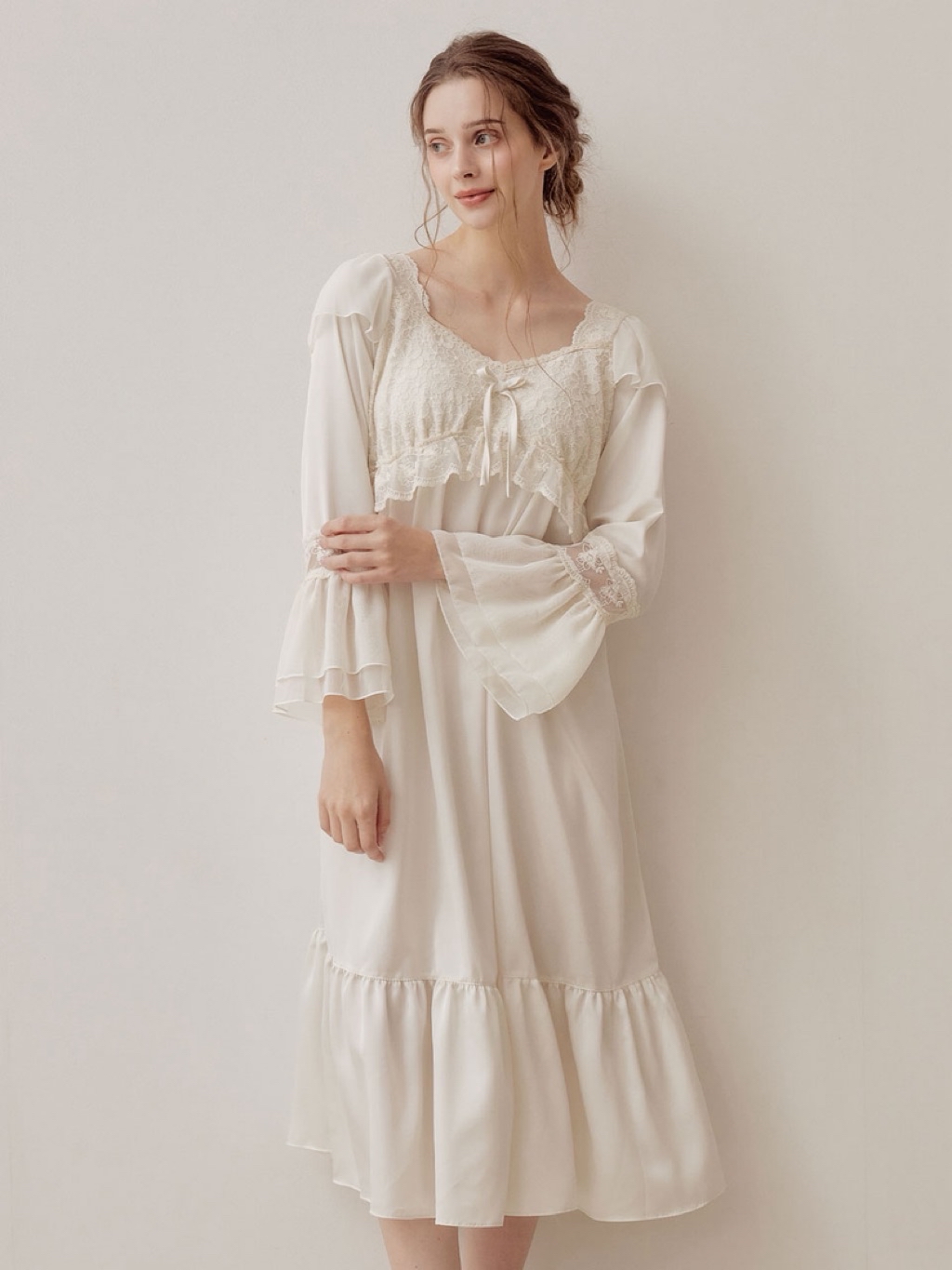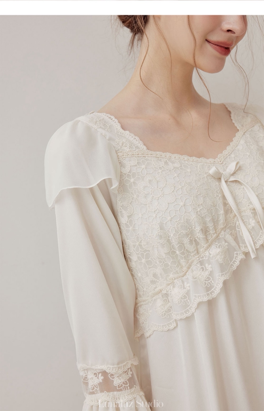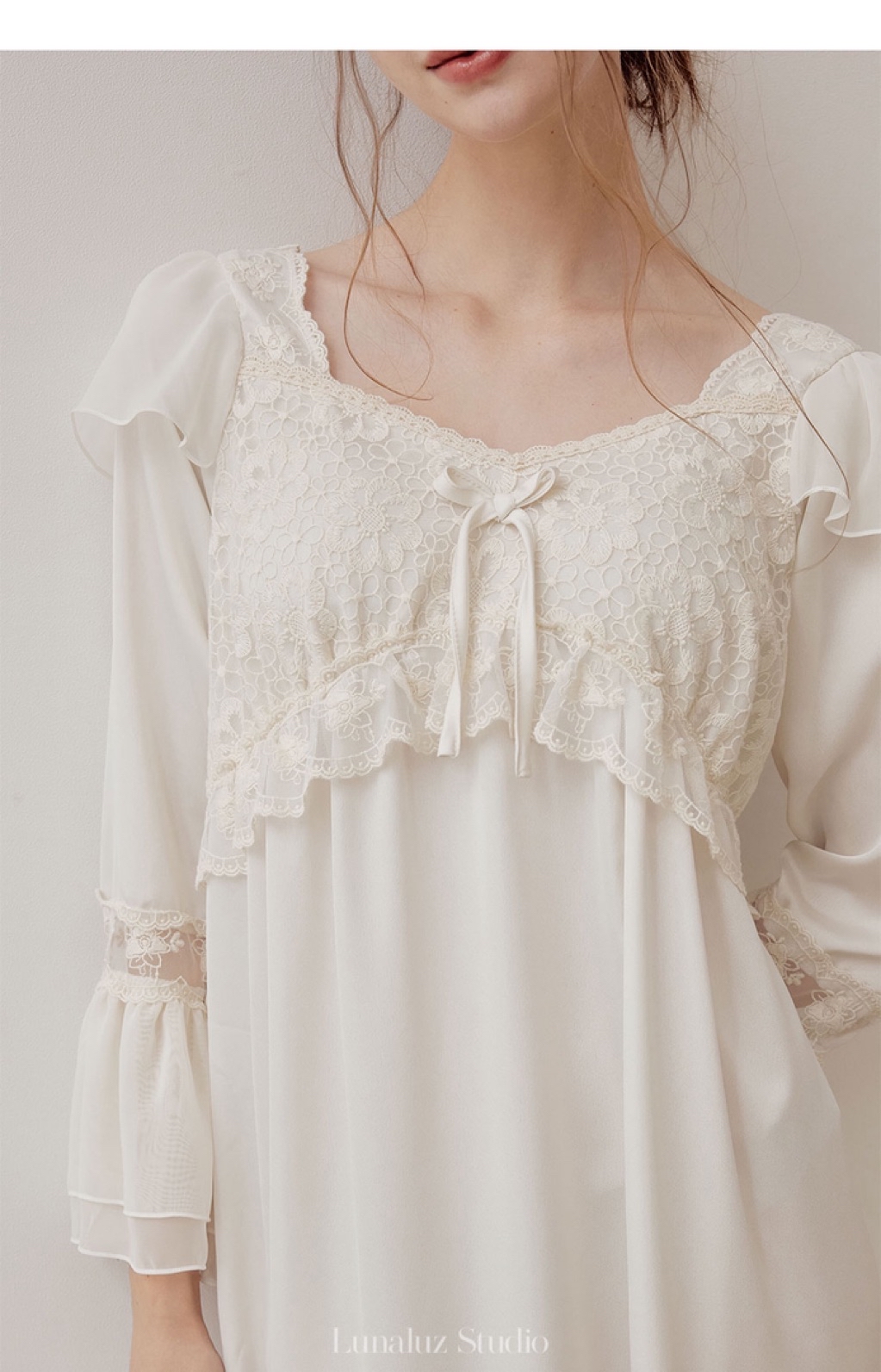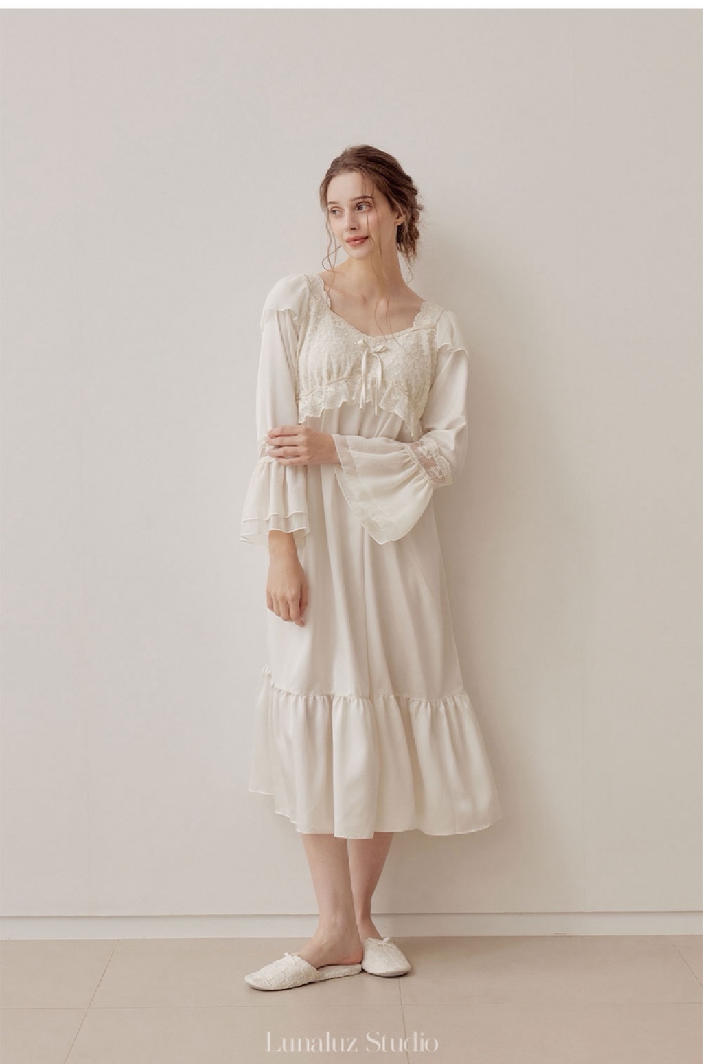 正韓☆LUNALUZ☆ 蕾絲拼接長袖睡裙|宮廷優雅風