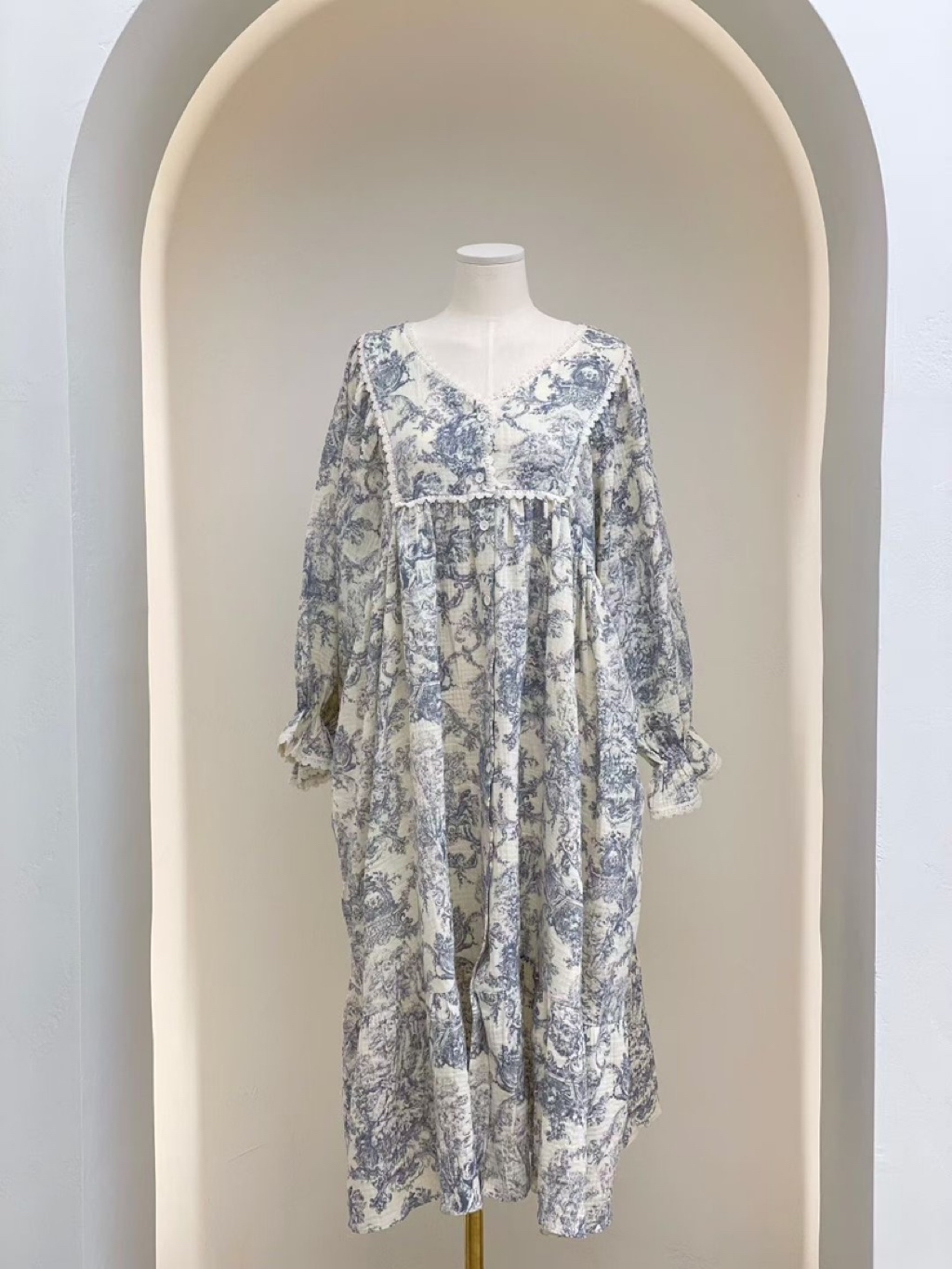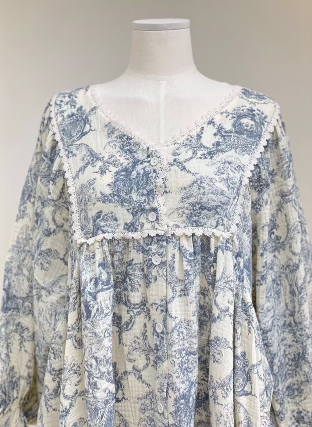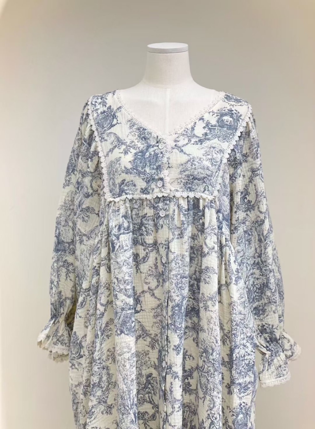 1-3天寄出 寬鬆版型☆LUNALUZ 藍白古典花紋 長袖長裙睡衣 Free size