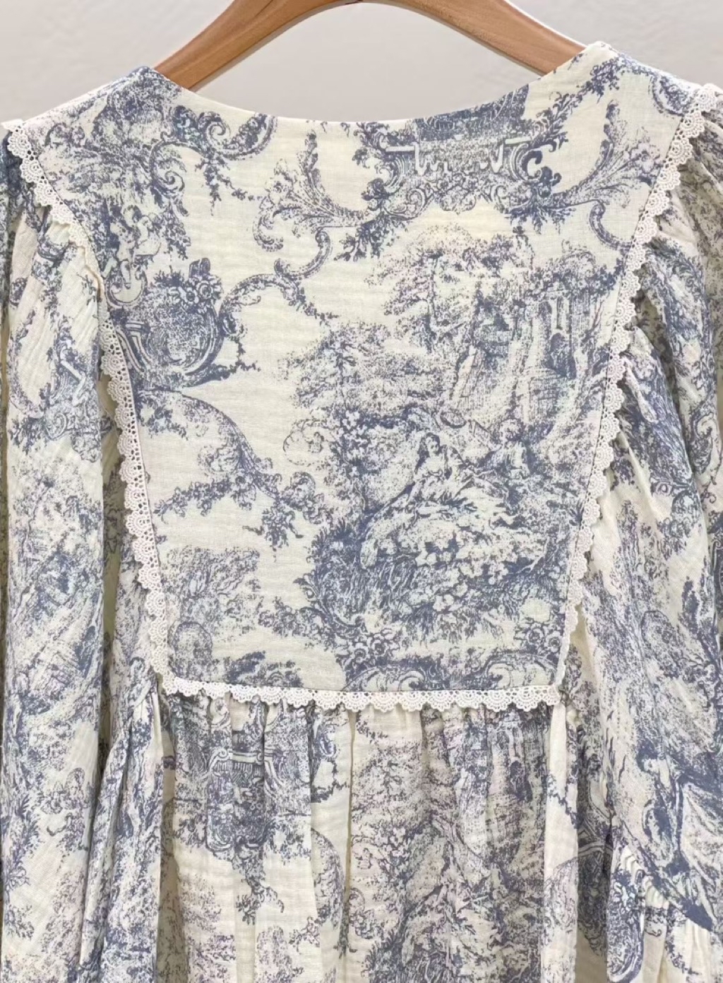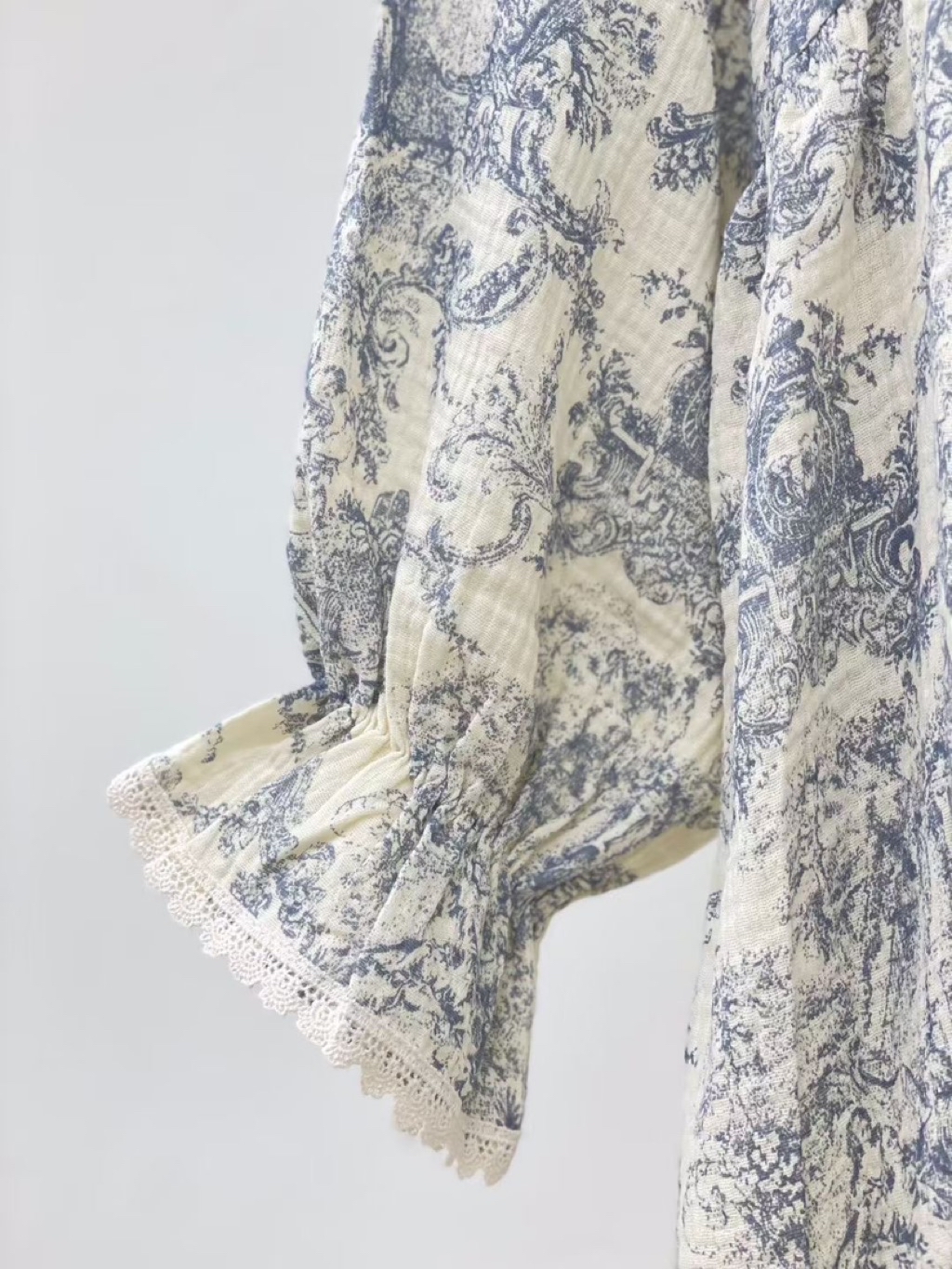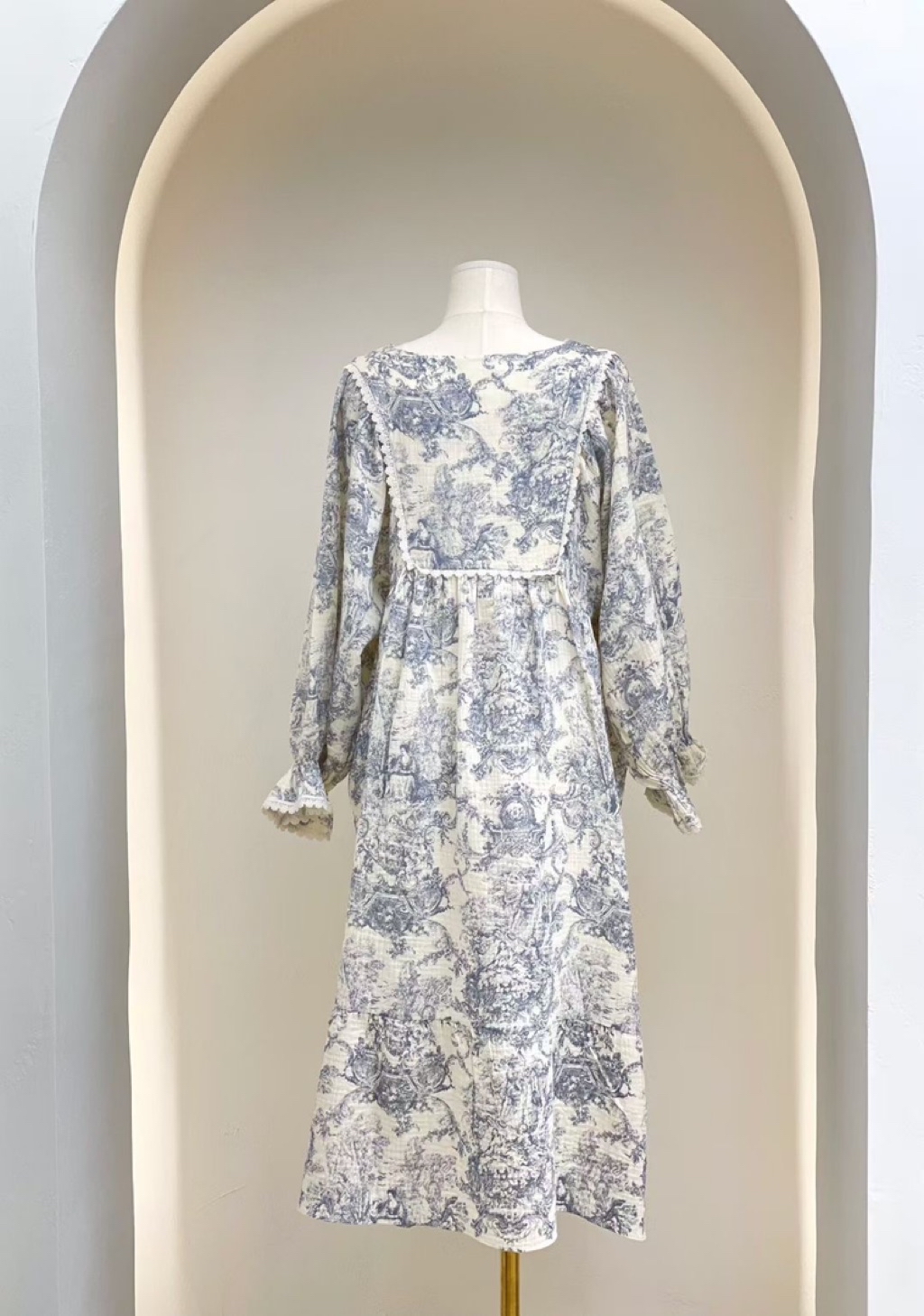 1-3天寄出 寬鬆版型☆LUNALUZ 藍白古典花紋 長袖長裙睡衣 Free size