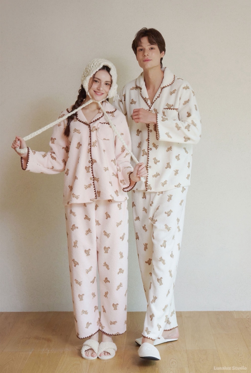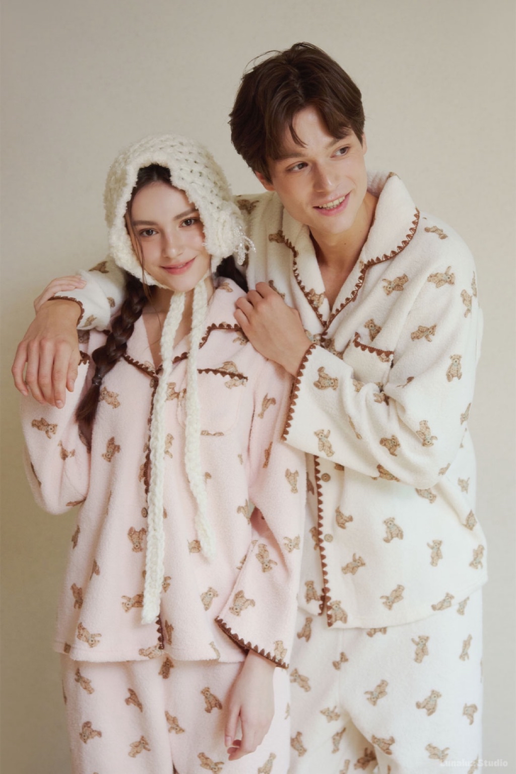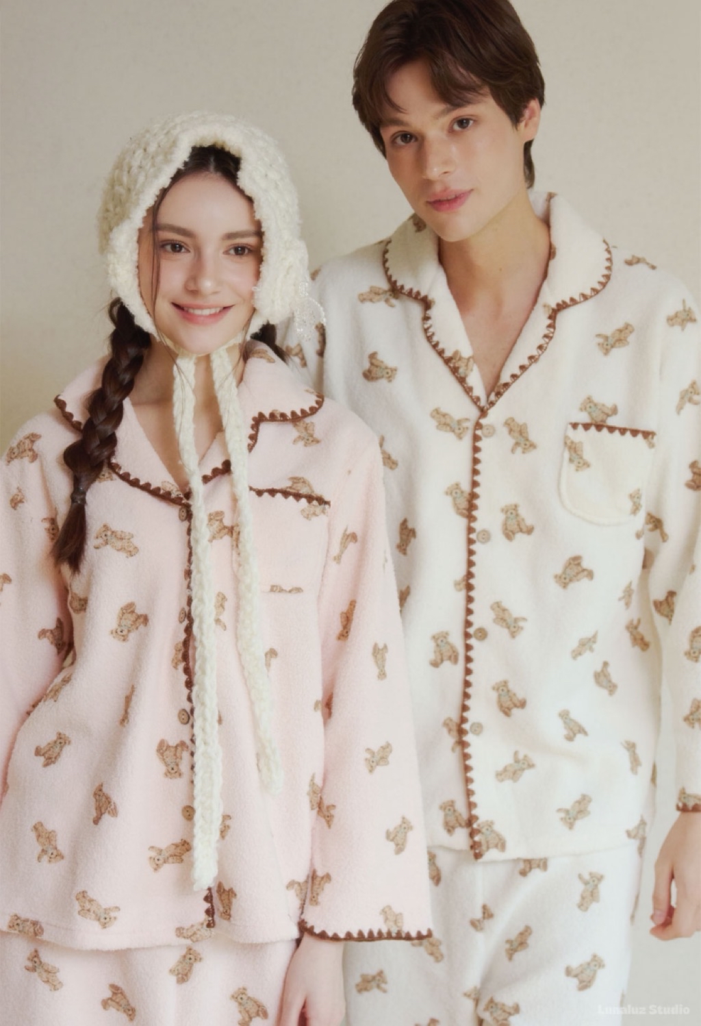 正韓☆LUNALUZ ☆ 小熊厚刷毛睡衣 男女套裝(cream / pink) 情人睡衣 韓國睡衣 居家睡衣