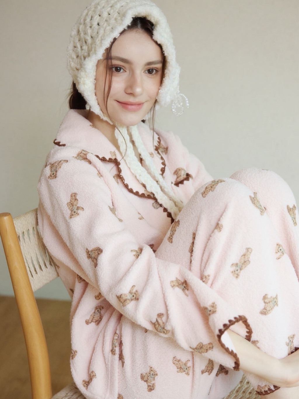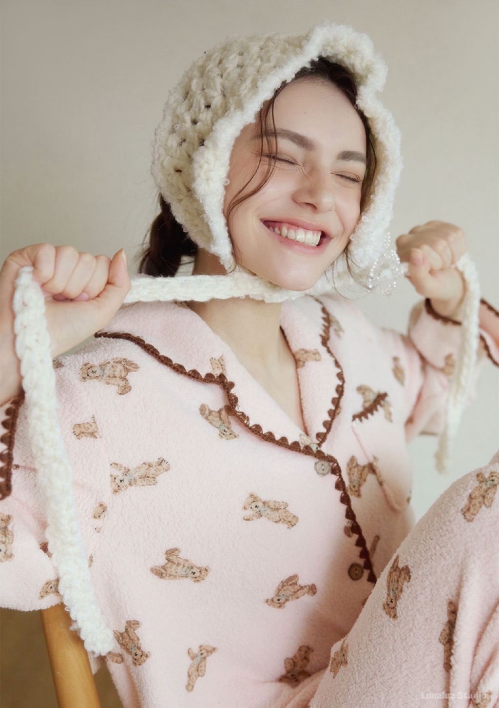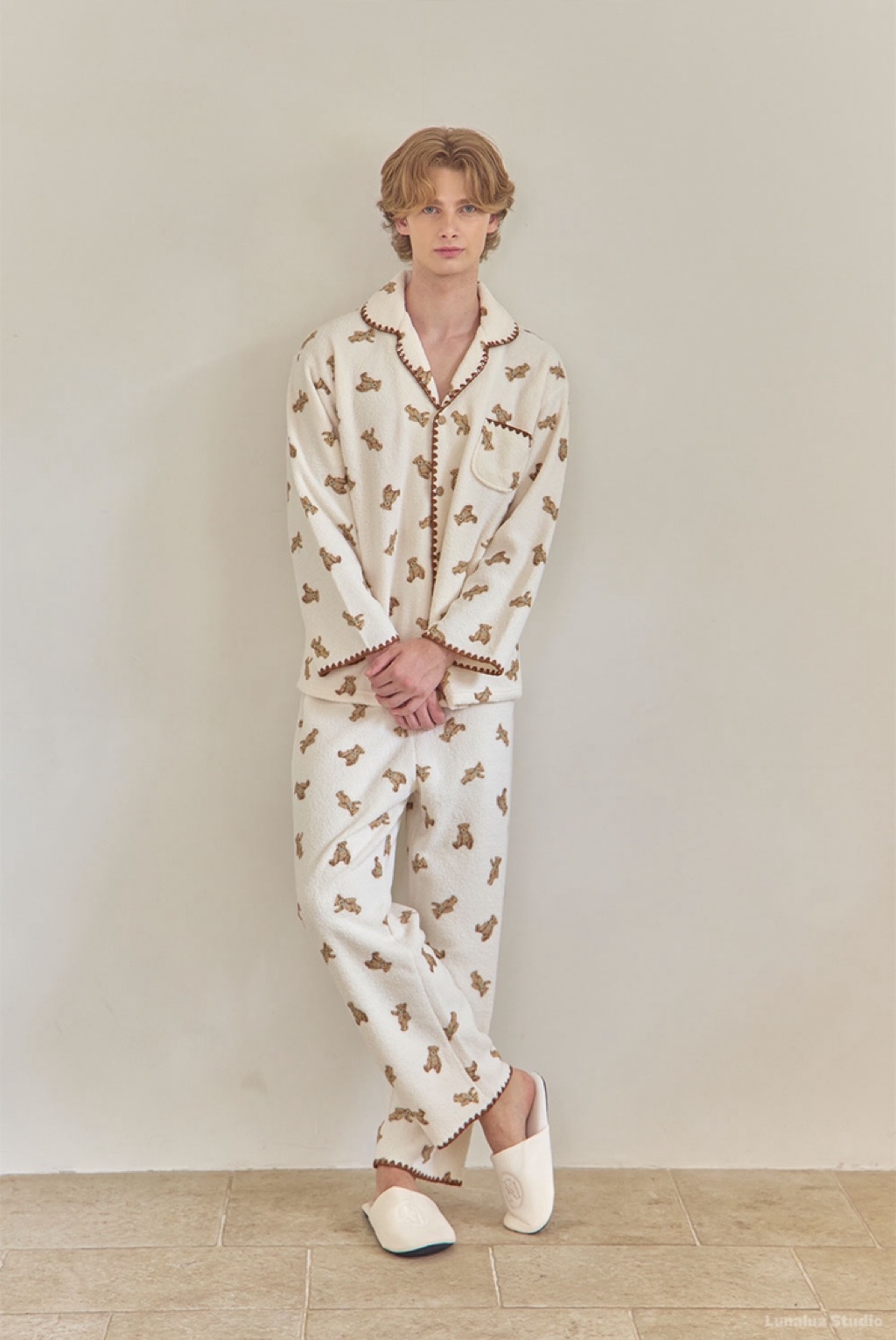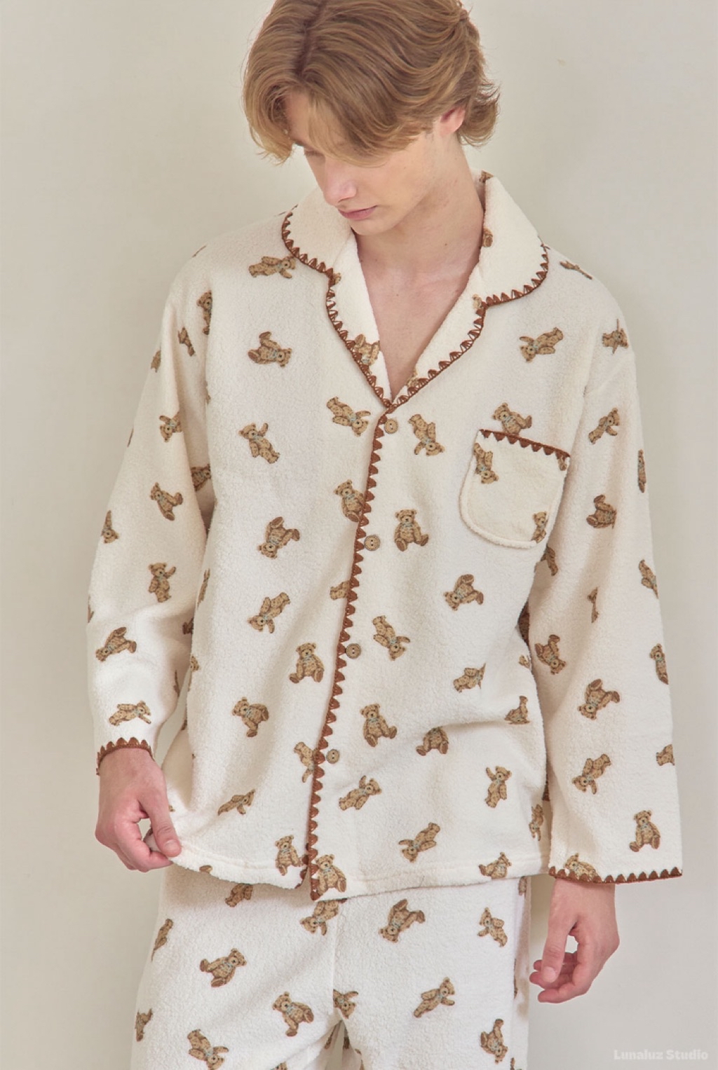 正韓☆LUNALUZ ☆ 小熊厚刷毛睡衣 男女套裝(cream / pink) 情人睡衣 韓國睡衣 居家睡衣