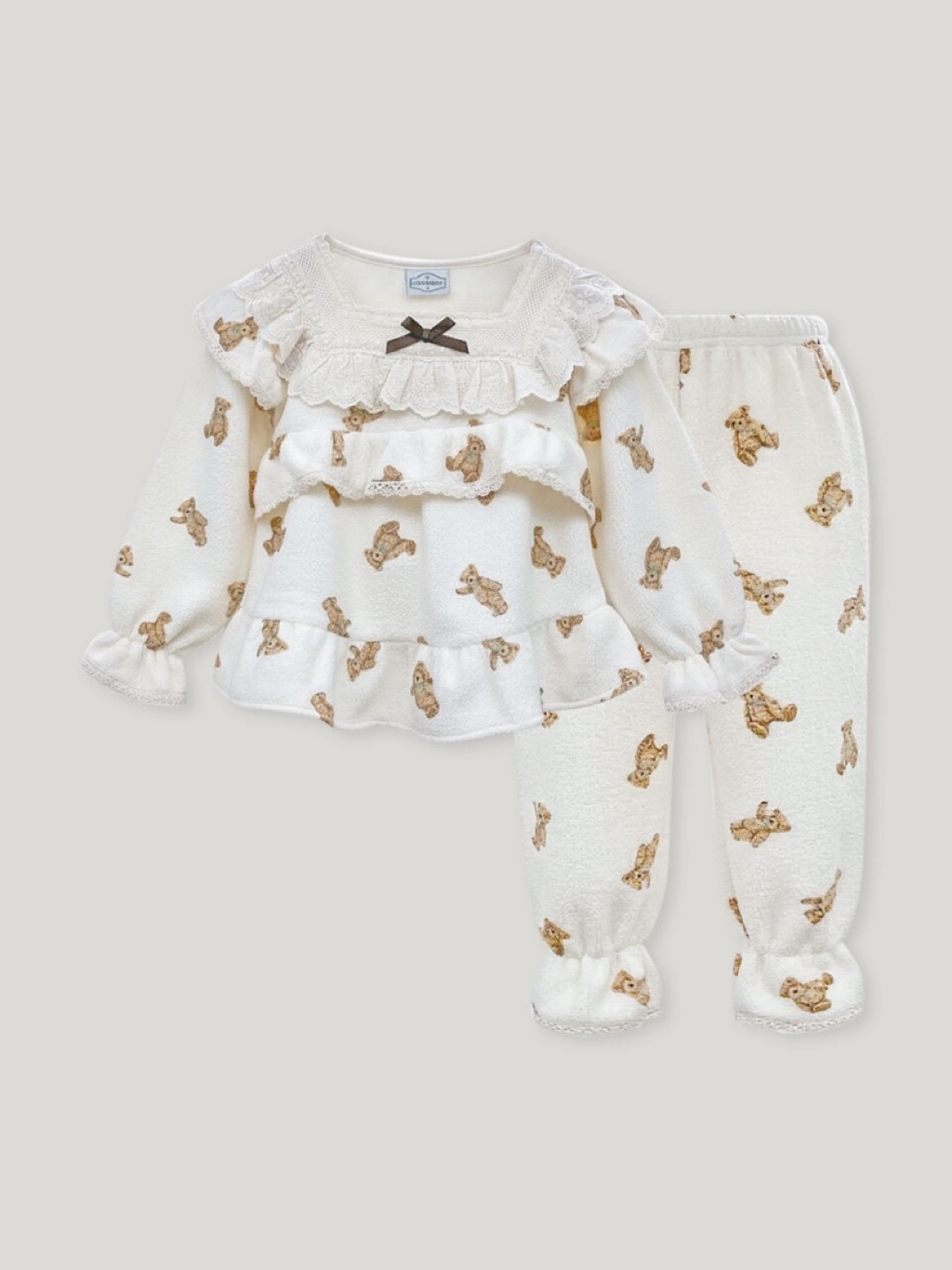 👶🏻👧🏻小朋友的睡衣_LUNALUZ【泰迪熊荷葉長袖睡衣套裝|奶油白】冬季款